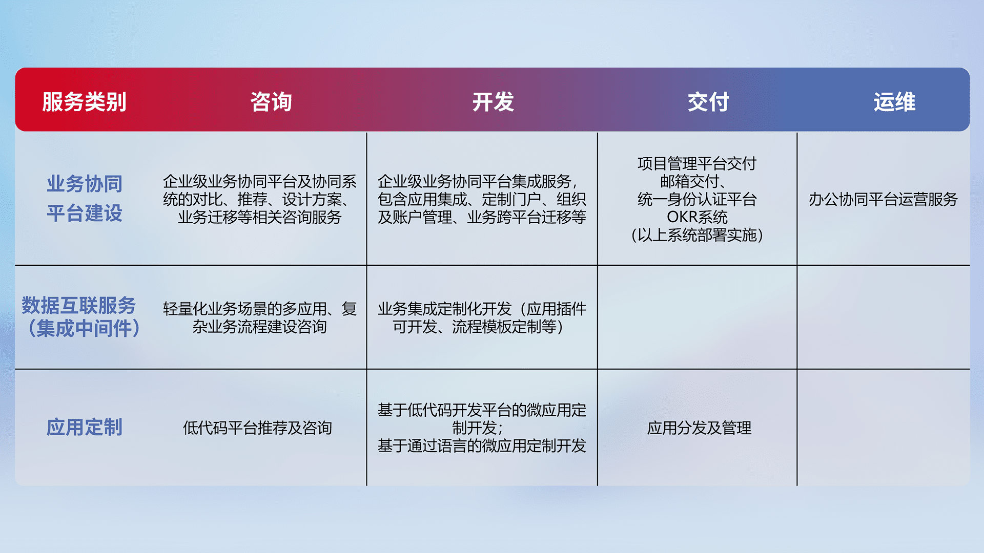 针对钉钉、、、、企微、、、、IDaas等平台级产品提供产品的规划、、方案、、交付、、、、定制化开发等服务,,,实现如统一协同办公、、智能客户服务、、、混合会议管理、、、智能数据查询、、、、等业务场景,,,,实现数字化转型。。。。